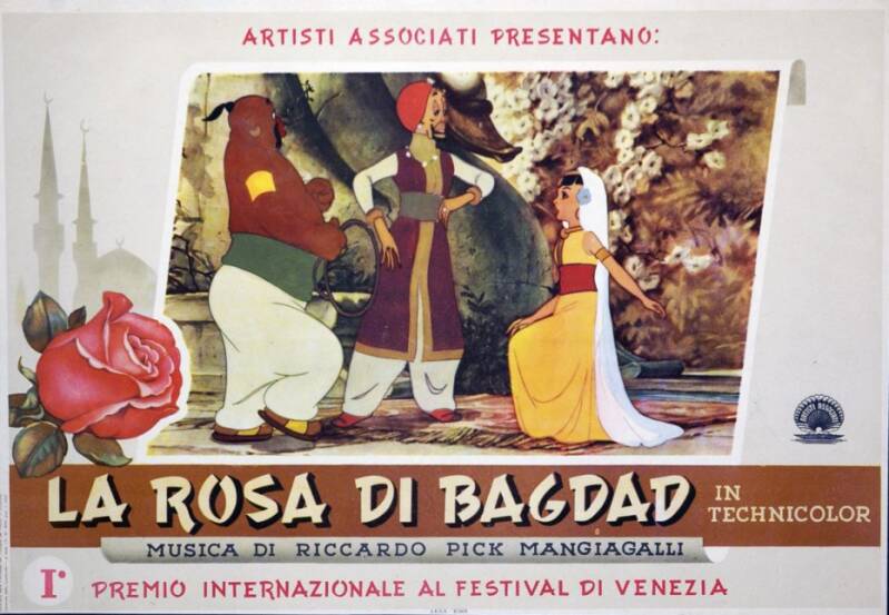 Ancora oggi, quando in Italia si parla di cinema di animazione, l’immaginario corre verso i classici della Disney oppure verso la produzione nipponica. Il nostro Paese, per questo tipo di cinematografia, è rimasto troppo spesso ancorato agli esempi americani, rivolti all’intrattenimento familiare. Ci sono stati autori validi, capaci di proporre un proprio stile narrativo, come Bruno Bozzetto (West and Soda del 1965, Vip – mio fratello superuomo del 1968, Allegro ma non troppo del 1976 e la serie del Signor Rossi, sviluppata in pellicole di vario metraggio) oppure Manfredo Manfredi (La maschera della morte rossa del 1971). Si tratta di inattesi exploit in una produzione altrimenti destinata ai più piccini, e inflazionata da stereotipi statunitensi. Non fa eccezione il coraggioso La Rosa di Bagdad (1949), realizzato a cavallo degli anni Quaranta da Anton Gino Domeneghini. Il film è un mediometraggio della durata di poco più di un’ora, primo in Italia ad essere girato in Technicolor (titolo conteso da I fratelli Dinamite di Nino Pagot, uscito lo stesso anno), ed è venuto alla luce in modo tormentato. Il soggetto è stato ideato all’inizio del decennio, il regista era stato colpito dalla visione di Biancaneve e i sette nani e voleva creare una ‘sua’ fiaba ispirandosi al celebre classico. Ci sono voluti ben sette anni per portare sugli schermi La rosa di Bagdad; raccolti i fondi necessari, a causa dei bombardamenti del 1942 che distrussero gli studi dell’IMA Film, la pellicola è stata completata tra Villa Fè d’Ostiani e Villa Secco in Franciacorta, e la Gran Bretagna, dove è stata ultimata.